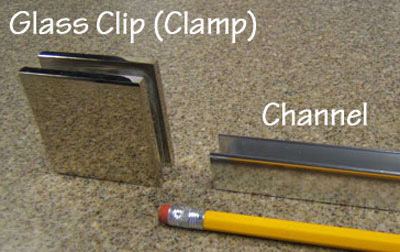 The fixed panel is fastened to the base and wall with either channel or clips.Channel is less expensive and is better if the tile is very uneven or the wall is humped (bowed).