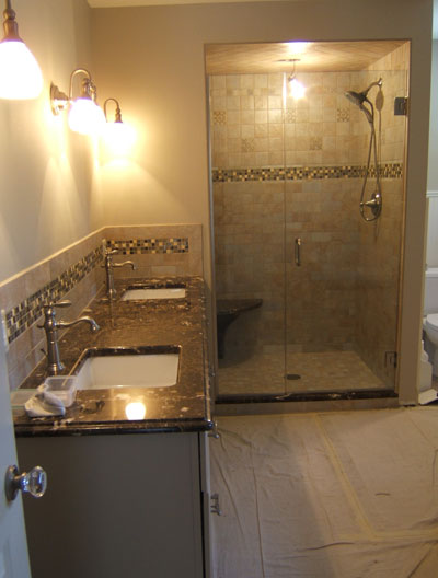 Door and notched panel in Bangor on a Swanstone shower. GC: Austin Toothaker