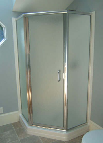 (left) Here is one of our semi frameless doors on an Aker Neo Angle shower